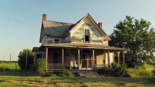 In the year 1882. A sun-beaten, twenty year old, two-level farmhouse, with a covered porch in rural Oklahoma. Directed by Katheryn Bigelow. Cinematic. Color. 32k. --style raw --ar 16:9 --v 6.0