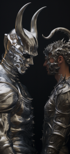 the devil standing over the shoulders of a knight in silver armor in the style of meme art, --ar 59:128