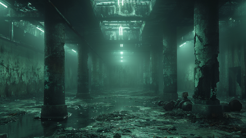 A crumbling, dark basement in an abandoned factory, thick pillars supporting the ceiling, broken machinery scattered across the damp concrete floor, rusted metal pipes running along the walls, flickering fluorescent lights casting eerie shadows, water dripping from the cracked ceiling, the air thick with dust and decay, cinematic, high-resolution, 8K, UHD --s 750 --style raw --v 6.0 --ar 16:9