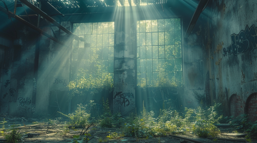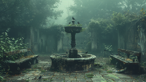 An abandoned urban square overgrown with plants and vines, cracked fountains and broken statues slowly crumbling, empty benches overtaken by weeds, the once busy heart of the city now quiet and eerie, pigeons nesting in the remains, fog rolling through the deserted streets surrounding the square, cinematic, high-resolution, 8K, UHD --s 750 --style raw --v 6.0 --ar 16:9