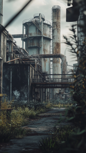 Generate a hyper-realistic, photorealistic image of an abandoned industrial complex in a dystopian setting, with symmetrical, massive structures in ultra high definition 8K resolution. Focus on the textural details of rusted metal and crumbling concrete, under an overcast grey sky that enhances the eerie, deserted ambiance. Overgrown vegetation adds a contrastive touch of green to the monochrome palette. Capture this atmospheric scene with meticulous attention to detail in textures and natural decay --ar 9:16 --v 6.1