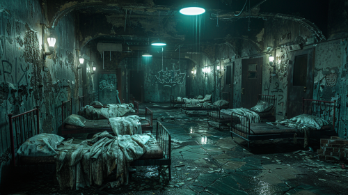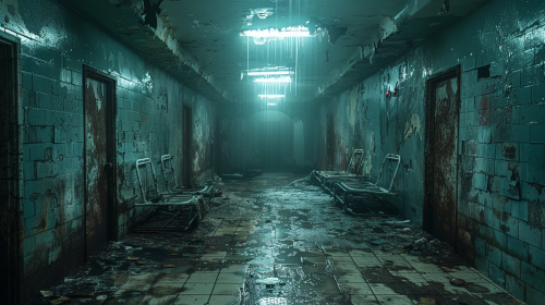A decrepit basement beneath a long-abandoned asylum, rusted metal beds and old straitjackets scattered across the filthy floor, broken, moldy walls covered in graffiti, flickering lights barely illuminating the dark, unsettling space, the faint sound of dripping water echoing through the corridors, an eerie and terrifying atmosphere of forgotten madness, cinematic, high-resolution, 8K, UHD --s 750 --style raw --v 6.0 --ar 16:9