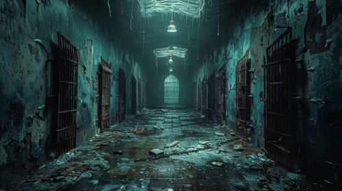 A dark, decaying prison basement, rusted metal bars and cell doors, broken chains hanging from the walls, cracked stone floors covered in debris, dim, flickering lights barely illuminating the cold, damp space, eerie echoes of forgotten voices, an atmosphere thick with despair and decay, cinematic, high-resolution, 8K, UHD --s 750 --style raw --v 6.0 --ar 16:9