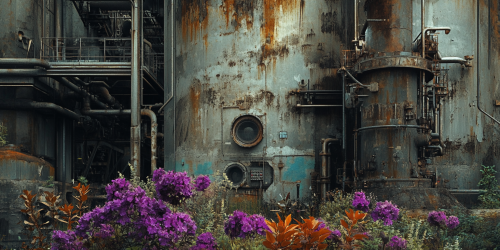industrial manafacturing building old and rusted equipment, dull and muted color palette, colorful purple flowers in the foreground, cinimatic lighting --ar 2:1