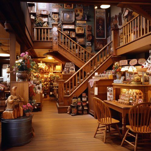 interior of a cute country and gift store. Hardwood floors. Sells gifts, food, and other items. Lots of decorative signs on the walls. Long counter for register along the back wall. Has rocking chairs. Modeled somewhat after Cracker Barrel. Stairs to a second level visible. Cluttered but cozy and inviting.