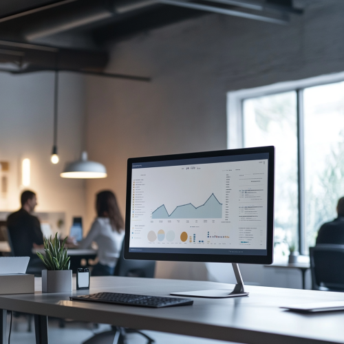 Minimalist office space with a modern computer displaying a clean growth chart, subtle data analytics visuals, small team of professionals gathered around, focused and collaborative atmosphere, few essential elements on the desk, plain background, soft ambient lighting, understated design with emphasis on teamwork and data, elegant and uncluttered.