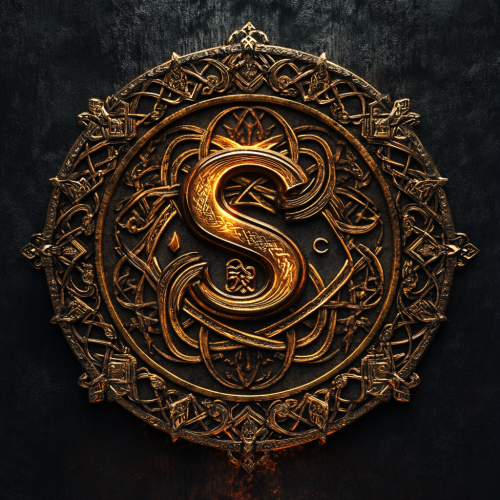Logo with letters S and C surrounded by intricate Viking-inspired patterns and abstract representation of sacred geometry and ornate patterns rendering with studio lighting, resulting in a hyper-realistic, three-dimensional effect --style raw