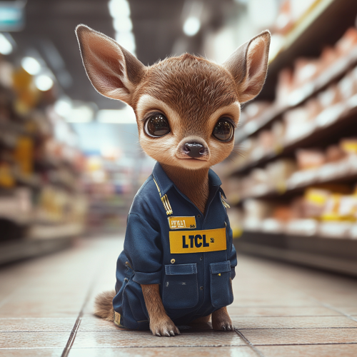 cute anthropomorphic baby deer fawn dressed in LIDL working uniform, he is a LIDL employee, working in the LIDL store, he is tired, broken, sad. photorealistic