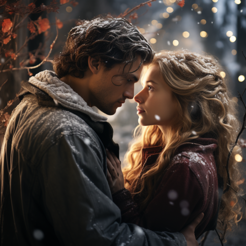 A man and a beautiful girl are depicted in full-length in a winter fairy tale setting through fantasy, realistic photography. The image boasts high detail, a cinematic quality, stunning visuals, hyper-realistic elements, sharp focus, high resolution (8k), and an insanely detailed presentation. --v 5.2 --s 450