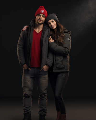 a photograph of a very attractive model couple at Christmas time. Modern couple. They are dressed for the cold weather, but they are very smart, classy and elegant. Full length, full body images only please! --ar 4:5