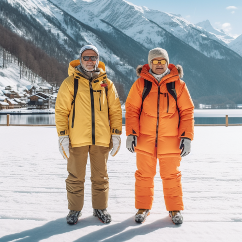 a couple of people aged 45 years in Bosco winter suits against the backdrop of the Alpine ski resort of Achensee, the weather is sunny, a lot of snow, trees, lake --v 5.1 --s 750