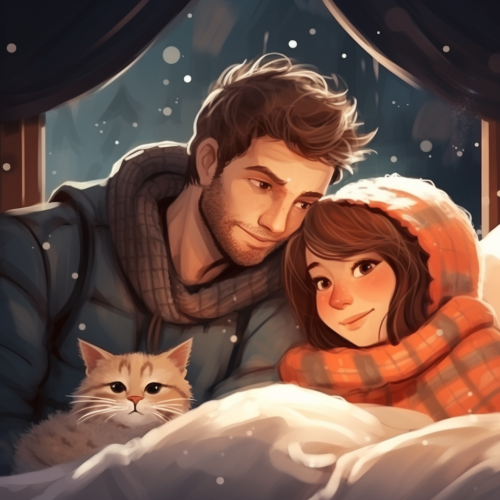 blonde man, brunette girl, cat, winter, cozy, in bed, cute illustration