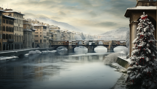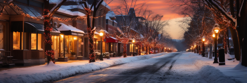 Christmas lights downtown in a mountain village in western North Carolina. Art deco. Christmas decorations on street. Christmas decorations on storefront displays. Hallmark style. Black and white with vibrant color splash. Beautiful Cobblestone streets. Deep Snow on the ground. 8 inches of snow. Mountains visible in the distance. Snow visible on the mountains. White Christmas lights. Beautiful Sunset. Award winning photo. Cinematic. Photorealistic. Stylish. High - end. Important. Mysterious. Shot with a Pentax. K - 3 III Monochrome. --ar 3:1 --q 0.5 --s 750