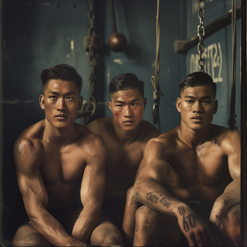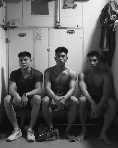 Three hot filipino chinese men, seated apart inside a gym locker room colorized looking in different ways--ar 1:1.8 --v 6.0 --style raw