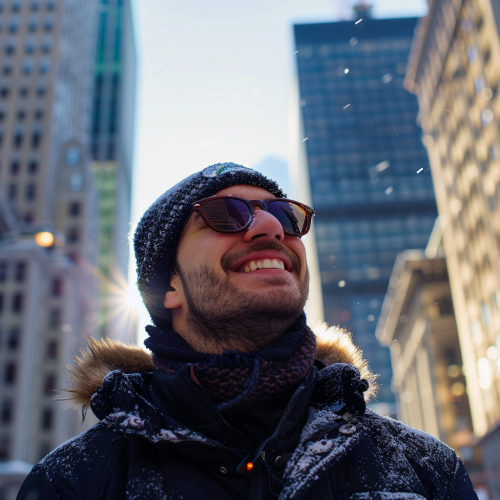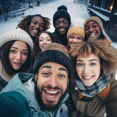 outside in a park during the winter, snowing, an African American woman walking in a park and looking back smiling, she’s wearing winter outside clothing, walking behind her is an African American man with a Afro, he’s in Awh, he’s wearing outside winter outside clothing and timberland boots, --ar 2:3