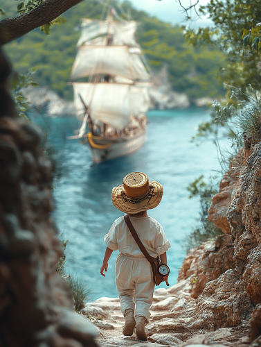 A young child or adolescent walking alone in a vast, desolate natural landscape, resembling a valley. The character is depicted from behind, positioned at the far end of the scene, emphasizing a sense of distance and isolation from the surrounding world. The landscape is realistic but with a slight artistic touch. The scene is in color, with soft lighting that suggests the warm, fading light of sunset. In the sky, a single swallow is visible flying far in the distance. --s 250