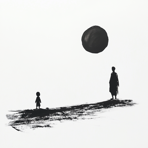 Create a minimalist ink sketch illustration, black on white background, showing the wise sage and the child standing side by side at the edge of a cliff, looking out over a vast, open landscape. The sage stands calmly with his hands behind his back, while the child stands in awe, gazing into the distance. Use simple, expressive brush strokes to capture a sense of openness, wisdom, and connection between the two figures. The scene should evoke a feeling of journey’s end and quiet reflection, with the focus on the bond between the sage and the child.