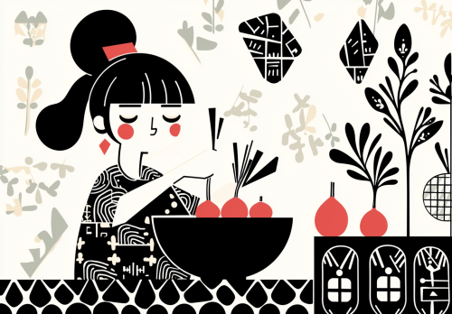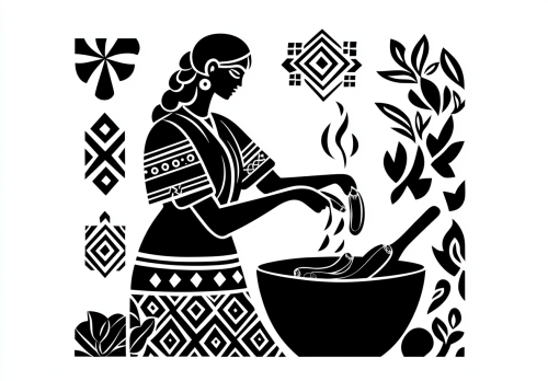 a girl cooking orecchiette, an icon in the style of ancient Slavic style, featuring Roman mosaic patterns, designed in the style of Tim Burton, white background, with bold outlines and geometric shape, only black and white, with simple details --ar 89:62 --q 2
