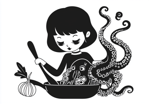 a girl cooks an octopus with onions inside a pan, an icon in the style of ancient Slavic style, featuring Roman mosaic patterns, designed in the style of Tim Burton, white background, with bold outlines and geometric shape, only black and white, with simple details --ar 89:62 --q 2