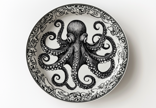 a plate with octopus with onions, an icon in the style of ancient Slavic style, featuring Roman mosaic patterns, designed in the style of Tim Burton, white background, with bold outlines and geometric shape, only black and white, with simple details --ar 89:62 --q 2