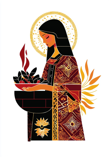 a black St. Nicholas cooking octopus in a pot, in the style of slavic icon of saints, featuring Roman mosaic patterns, with bold colors vector illustration with bold outlines and geometric shapes on a white background, in a flat design, suitable for use as a logo, sticker, clip art, or graphic printmaking, only red and gold colors, --ar 62:89 --q 2