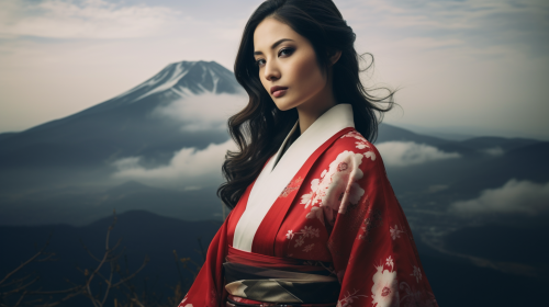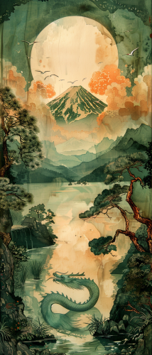 japanese temple i the 13h century , fuji montain, dynamic movement landscape --ar 4:2