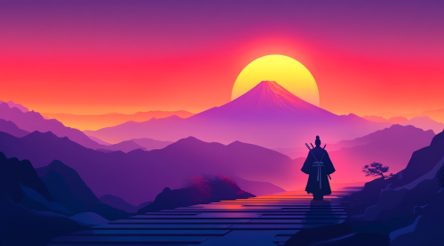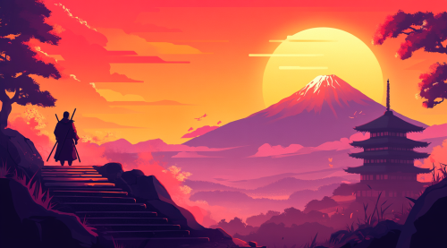 A samurai in the far left part of the image, looking at the path in front of him with stairs that lead to the Mount Fuji in the background on the far right side of the image, sunset, simple flat illustration style, vector art, minimalistic, simple shapes, simple colors, simple details, digital painting, red and orange gradient sky, wide-angle shot, side view, game scene, game art design, simple background, simple shapes, simple colors, simple details, digital painting, red and purple color palette, symmetrical composition, fantasy world theme. --ar 128:71 --v 6.1