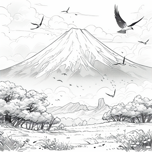 Illustrate a coloring page black line only "Japanese Crane flying over Mount Fuji", in style of the Anime "Akira". Only black lines. Coloring book for kids. --s 750 --niji 5