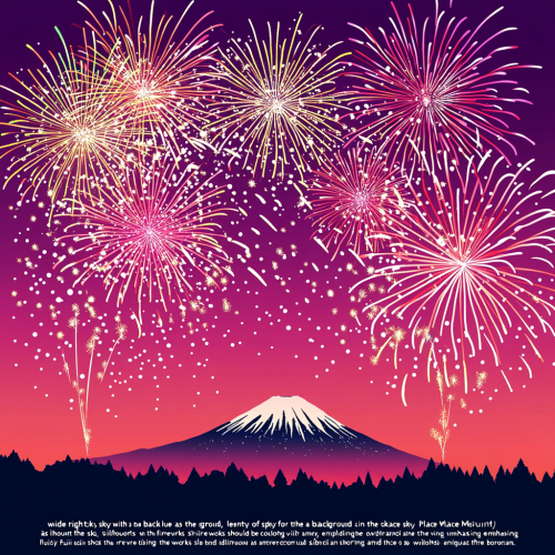 "A wide night sky with a pink hue as the background, leaving plenty of space in the sky for text. Place Mount Fuji as a silhouette at the bottom of the image, with fireworks exploding in the sky. The fireworks should be colorful, emphasizing vibrancy and happiness."
