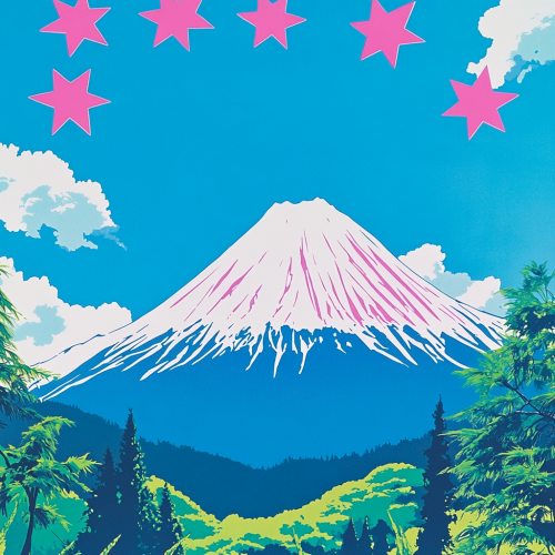 Starry Sky: The starry sky is depicted in tones of pink and rose gold, with sparkling stars scattered throughout. These stars symbolize hope and dreams, creating a happy atmosphere in the night sky. Mount Fuji: Mount Fuji is expressed in a soft rose-colored gradient, with a silhouette that is simple yet powerful. The summit of Mount Fuji is highlighted with a slightly brighter pink, adding a glow reminiscent of a sunrise. Background: The overall background features a rose-colored gradient, transitioning from darker to lighter shades as you move upward. This creates a world filled with happiness and positive energy. Overall Tone: The design is based on a romantic and bright palette of pinks and rose colors, with a touch of gold to add a sense of elegance and hope.