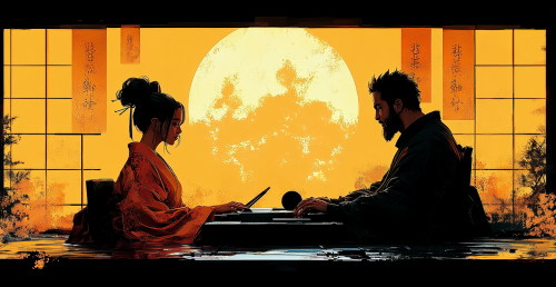 samurai x anime style - a cyberpunk room with a geisha female doing a podcast with a male samurai, with cryptocurrencies like bitcoin banners all over the room, all gradient colors in yellow and gold --ar 365:188 --s 750