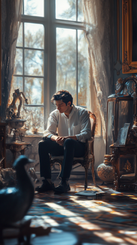 Scène réaliste d'un homme qui garde tout pour lui, illustrant son égoïsme et son isolation. L'homme est montré dans un environnement luxueux, comme une pièce remplie d'objets précieux ou de biens matériels, qu'il conserve jalousement pour lui-même. Il est assis ou debout, avec une expression de satisfaction ou de méfiance, entouré de ses possessions, tandis que les autres personnes sont figurées en arrière-plan, floues ou éloignées. L'image doit capturer le contraste entre l'isolement de l'homme et son environnement riche, avec une attention particulière aux détails et à la lumière. HDR, 8k, --ar 9:16