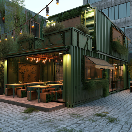 Design some container restaurants, with military green skins, multiple containers combined together, with a strong sense of design --v 6.0
