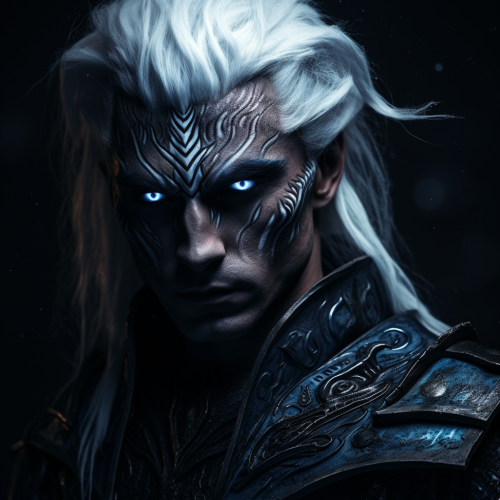 Dark elf man with blue skin and white hair surrounded by magical darkness, dark fantasy aesthetic, high detail, hyper-realistic.