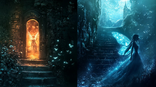 we see all this from a profile prespective, on the left we see a glowing fairy about to open a door which leads to downward stairs full of darkness, on the right we see a glowing fairy about to open a door which leads to upward stairs full of light --ar 16:9