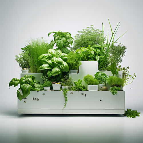 a container garden filled with various herbs, light green and white, in the style of flat surfaces, some plants are placed in a container, in the style of tabletop photography, innovating techniques, rectangular fields, light green and white, feralcore, provia, in the style of futuristic minimalism,softbox lighting, precisionist lines, felinecore, sfumato, lively tableaus