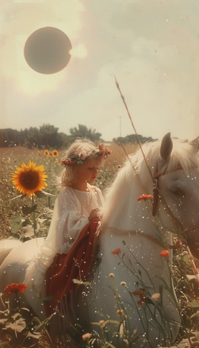 a photorealistic image of a blond baby with a flower crown, riding a white horse, the baby is holding a red cloth, in the background there is a sunflower field and a gigantic sun, Light pastel colors, ethereal light, a bit out of focus --sref 1809476652 --ar 4:7 --v 6.0 --s 250
