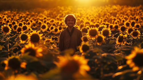 Samwise Gamgee standing in sunflower field, smiling warmly.