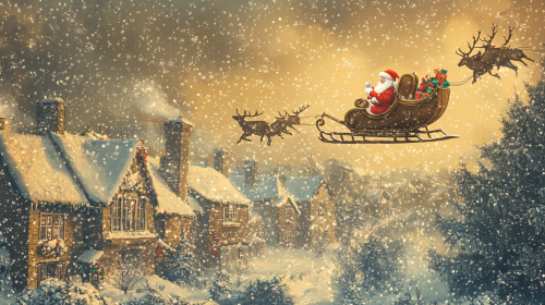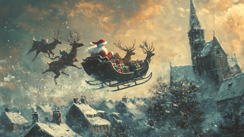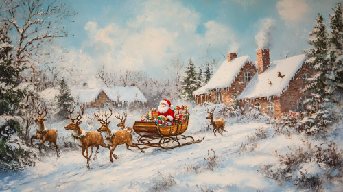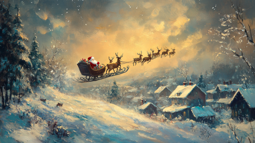 vintage painting, classic christmas style, santa riding sleigh with reindeer steering sleigh over a house/town on a snowy morning. winter season, chritmas day. classic vintage. include presents in the back of the sleigh. muted colors. --ar 16:9