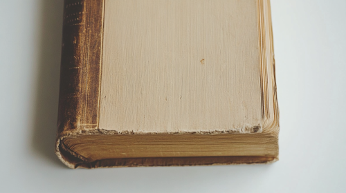 a vintage book. Image of book is viewed from the top looking down laying on table. The book is at slight angle so thickness of book is visible. Table is completely white nothing else is on table --ar 16:9