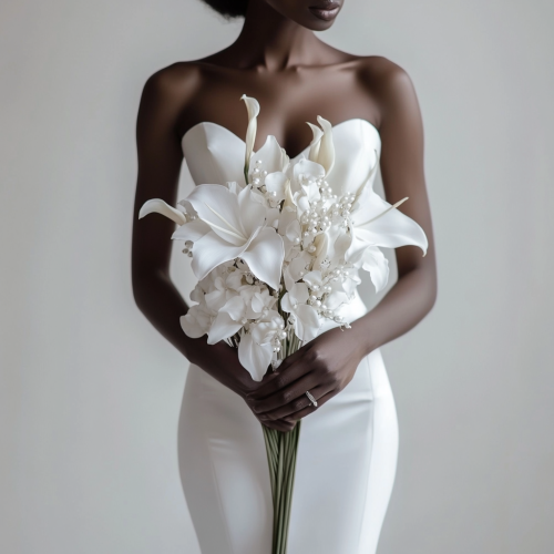 wedding dress, bottom is satin, the bodice is shaped like a white lily with pistils made of pearls as small accents, very minimalist style dress, black model, white studio background