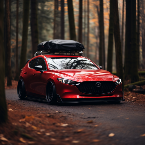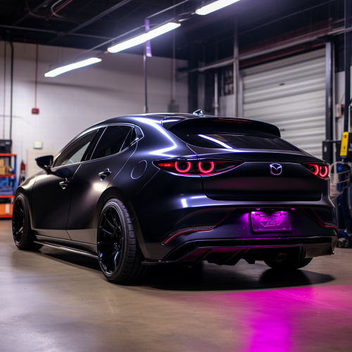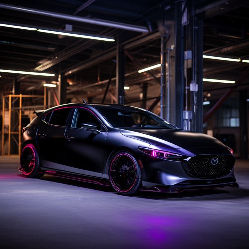 custom satin black 2020 Mazda 3 hatchback, 64k, cinematic, purple dramatic lighting
