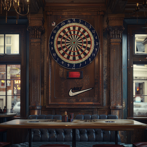 create a classic dart board in white/blue/red colours and with Nike branding. In a traditional british pub setting.