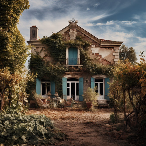 maison, dans le style du cinquième élément, photographie argentique, point de vue frontal, vignes autour, couleurs intenses --v 5.2