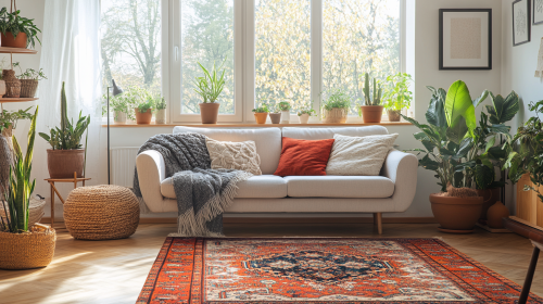 Create an image of a Scandi Boho living room that combines the simplicity of Scandinavian design with vibrant bohemian accents. The room should feature clean lines, minimalist furniture, and colorful textiles. Soft, natural lighting should enhance the stylish and dynamic space. Include elements like patterned rugs, eclectic accessories, and cozy furnishings. Capture the entire room to showcase its unique and inviting look, making viewers want to see more Scandinavian simplicity meets boho flair ideas.Camera: DSLR - Canon EOS 5D Mark IV. Lens: Canon EF 24-70mm f/2.8L II USM. Composition: Wide shot, room-centered, horizontal orientation, balance between furniture and space. Film: Digital, high resolution, color profile sRGB. Camera settings: ISO 400, f/2.8, 1/60 sec. --ar 16:9 --v 6.1 --s 250