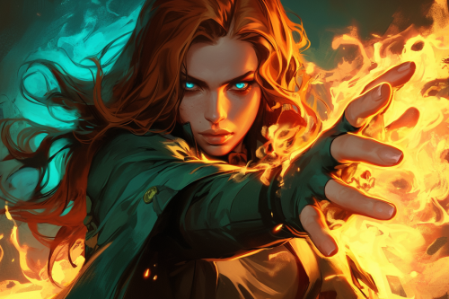 a woman with long auburn hair and blue eyes wearing a green coat holding her hand out shielding herself from a geyser of fire + horror + art style of Capullo, Brom, Whelan, aly fell rutkowski, art germ, rossdraws, and franzzeta + art station + ultra detailed + hyper realistic + 8k --ar 3:2 --niji 6