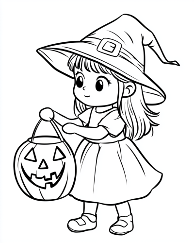 coloring page for kids, boy with witch hat and trick or treating bag, single object, minimalist, thick line, low detail, no shading --ar 4:5 --v 6.1 --style raw