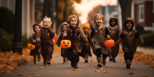 group of ten children trick or treating running down the street side by side, photo, --ar 6:3