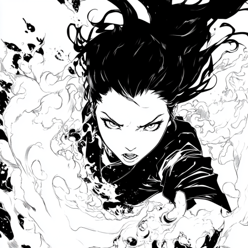 Create a manga character: a phoenix woman with flame powers, in the style of Mappa Studios, black and white with only 1-2 accent colors, black outlines, white background, terrifying, Scary creepy, horror, simple to draw, drawn in the style of Jujutsu Kaisen, –ar 13:28