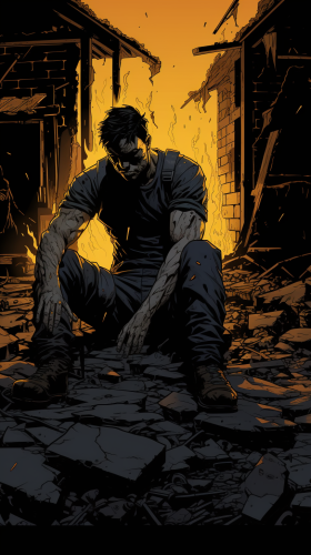 dark silouehette of a man with third degree burns, wearing pajamas, crawling on all fours, pulling himself out of the charred ruins of his burned house. Incorporate elements of line art in the style of Todd MacFarlane, blending influences from comic book aesthetics. 12k, full color. Utilize advanced rendering techniques, such as octane render, to achieve a visually striking result, --ar 9:16 --v 5.2